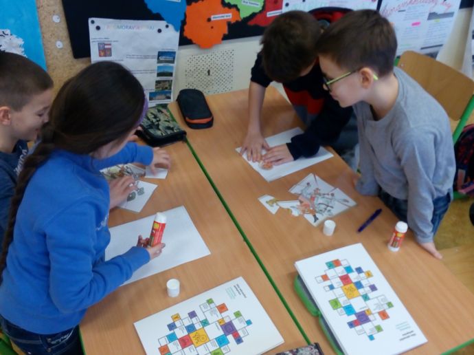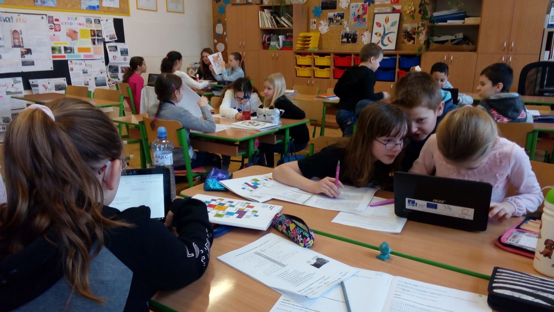 Již včera jsme se "naladili" videem o nejznámějším díle Boženy Němcové, o Babičce. Dnes jsme navázali skládáním puzzle, hádankami, křížovkami a doplňovačkami ze života a díla slavné spisovatelky. Poznat podle ukázky, o kterou pohádku se jedná, dalo nejednomu týmu zabrat. Ale zvládli to všichni. Vydechnout si děti mohly ve výtvarné výchově, nad kresbou Boženina portrétu.