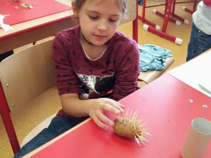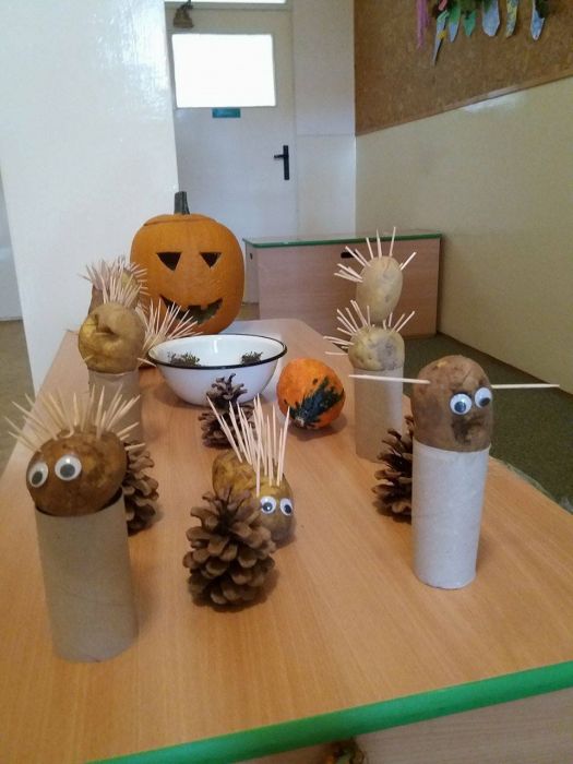 Ve středu jsme si měli přinést brambory. Proč? Čekal nás BRAMBOROVÝ DEN. Četli jsme si básničku a povídali si - kde a jak rostou, co se z nich vyrábí, jak se sklízí a skladují. Počítali jsme bramborové příklady, zpívali a také jsme z brambor vyráběli. Nejdříve jsme si zkusili vyrobit razítka, kterými jsme natiskli listy na strom. Největší zábava pak byla výroba postaviček.