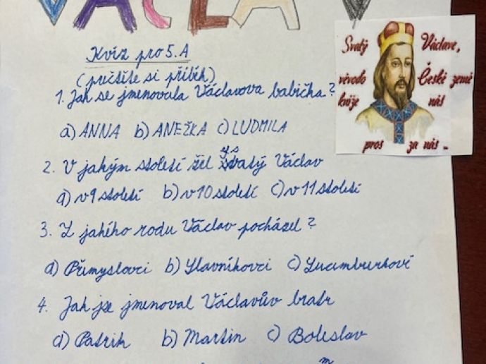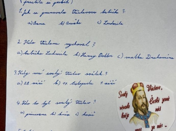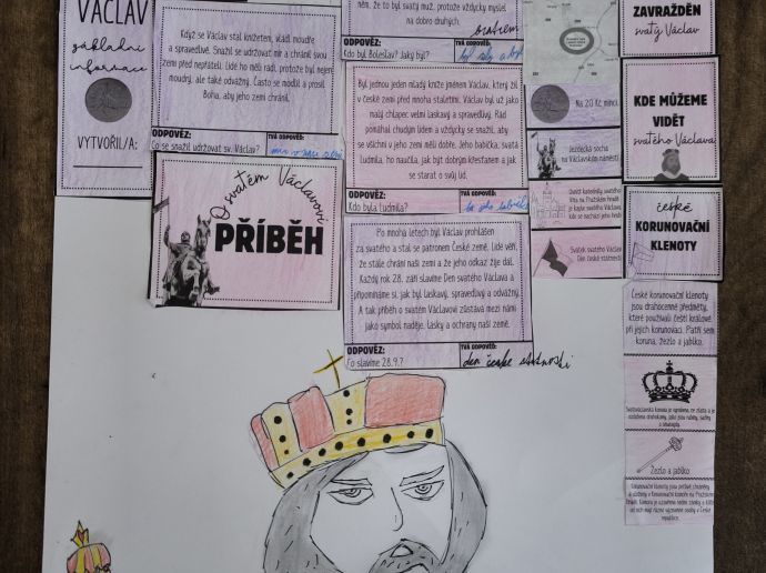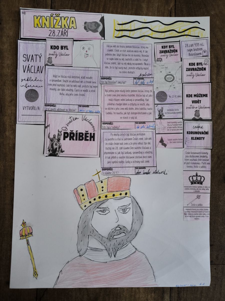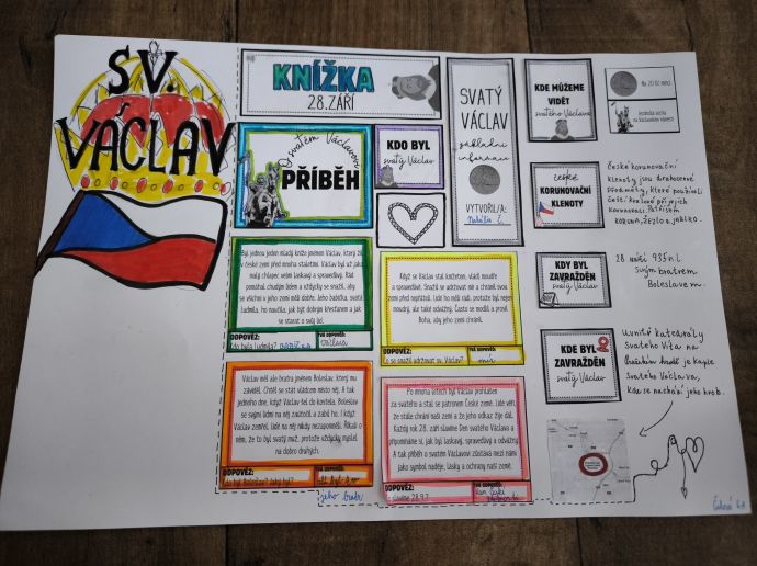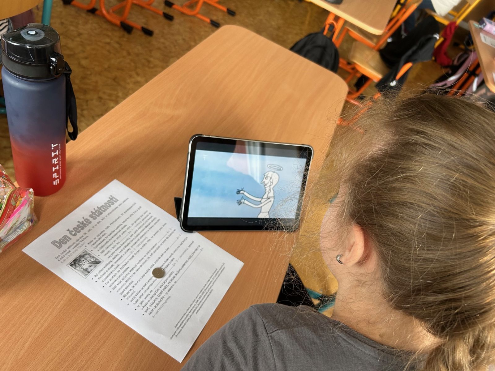 V neděli jsme si připomněli Den české státnosti. Je to významný svátek, a tak jsme se i my ve škole pověnovali patronovi naší země, knížeti Václavovi. Informace o tomto světci ukryté v různých šifrovačkách jsme doplňovali do textu a pomocí tabletů je poté porovnali s komiksovým zpracováním pověsti. Starší žáci si pak pro své spolužáky připravili několik kvízů.
