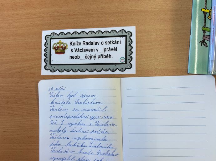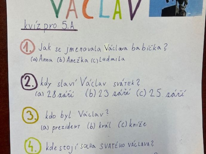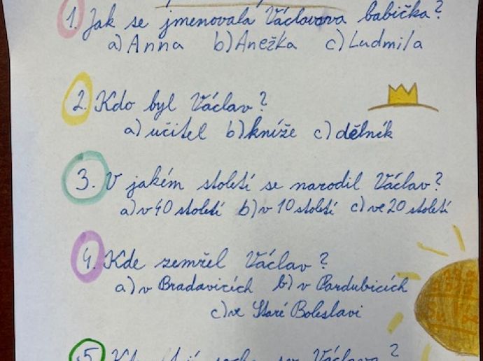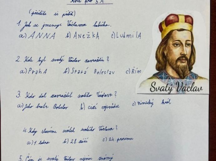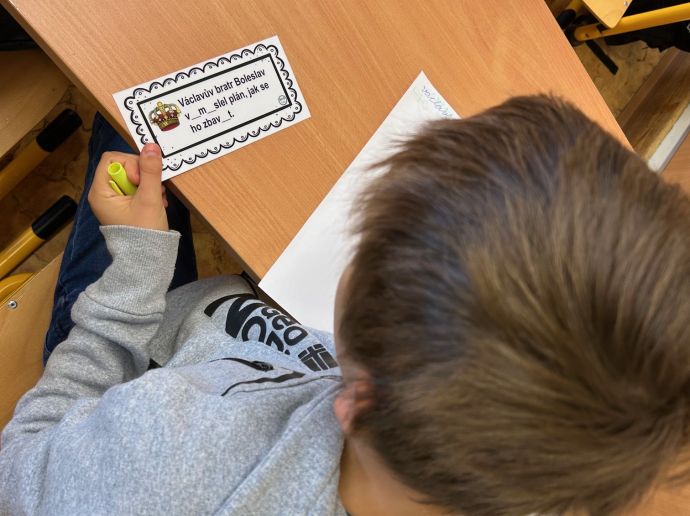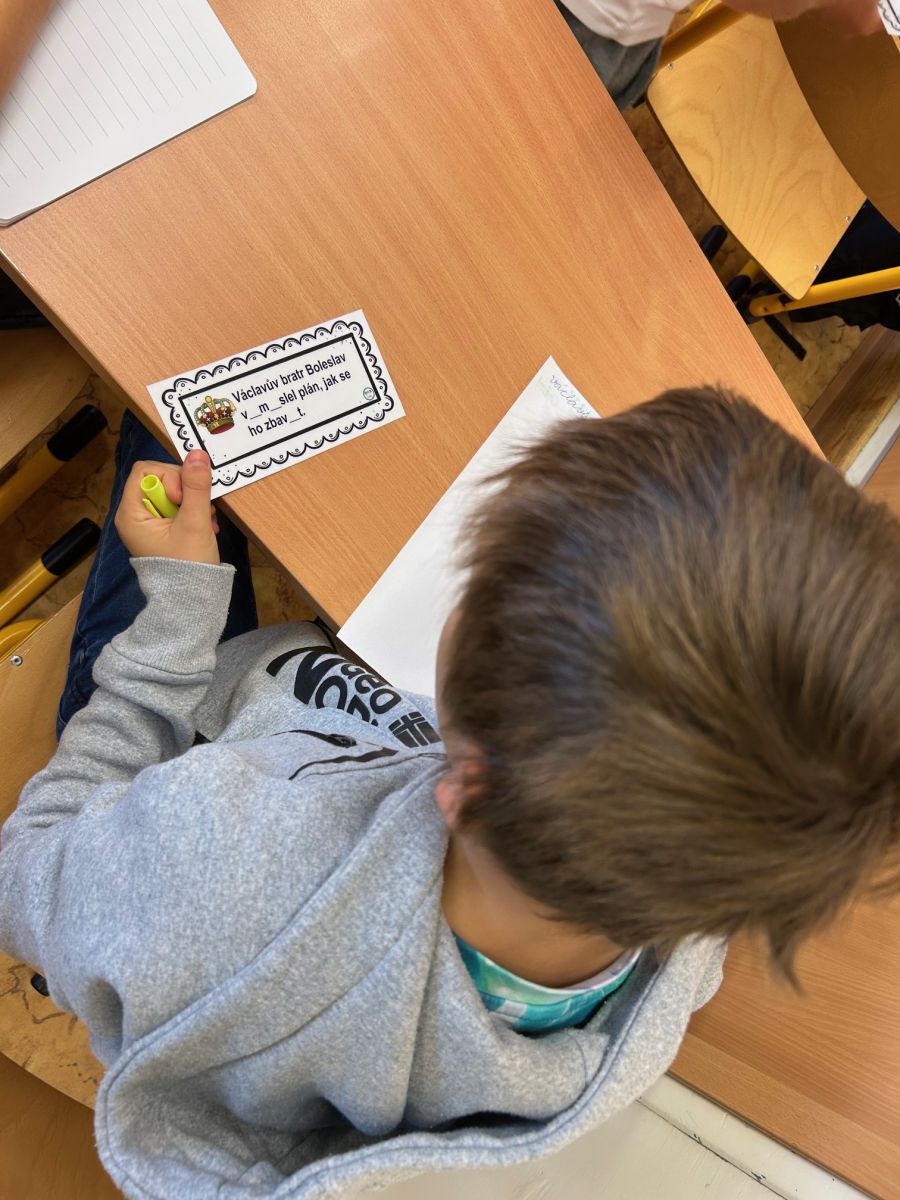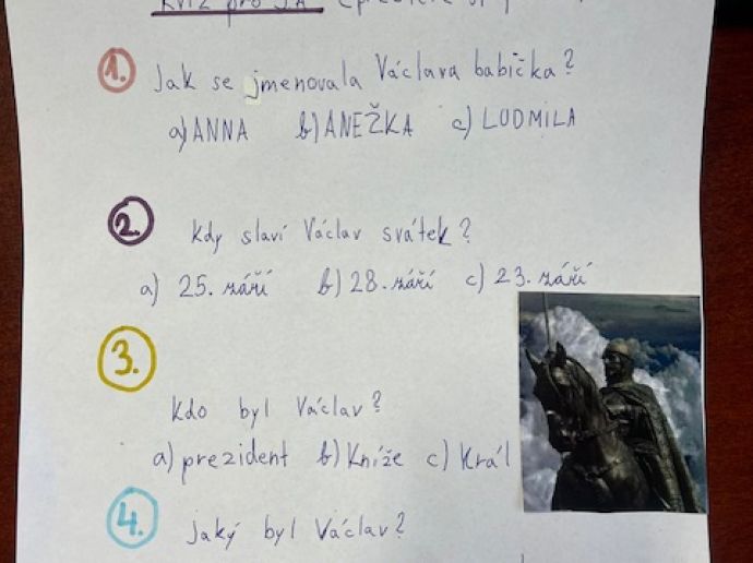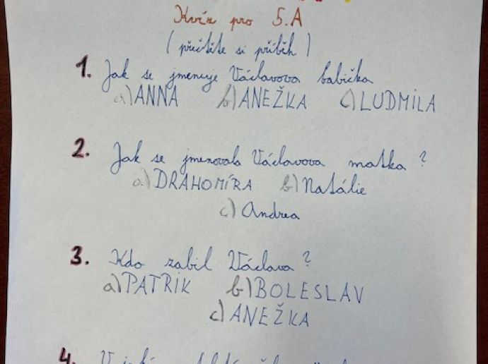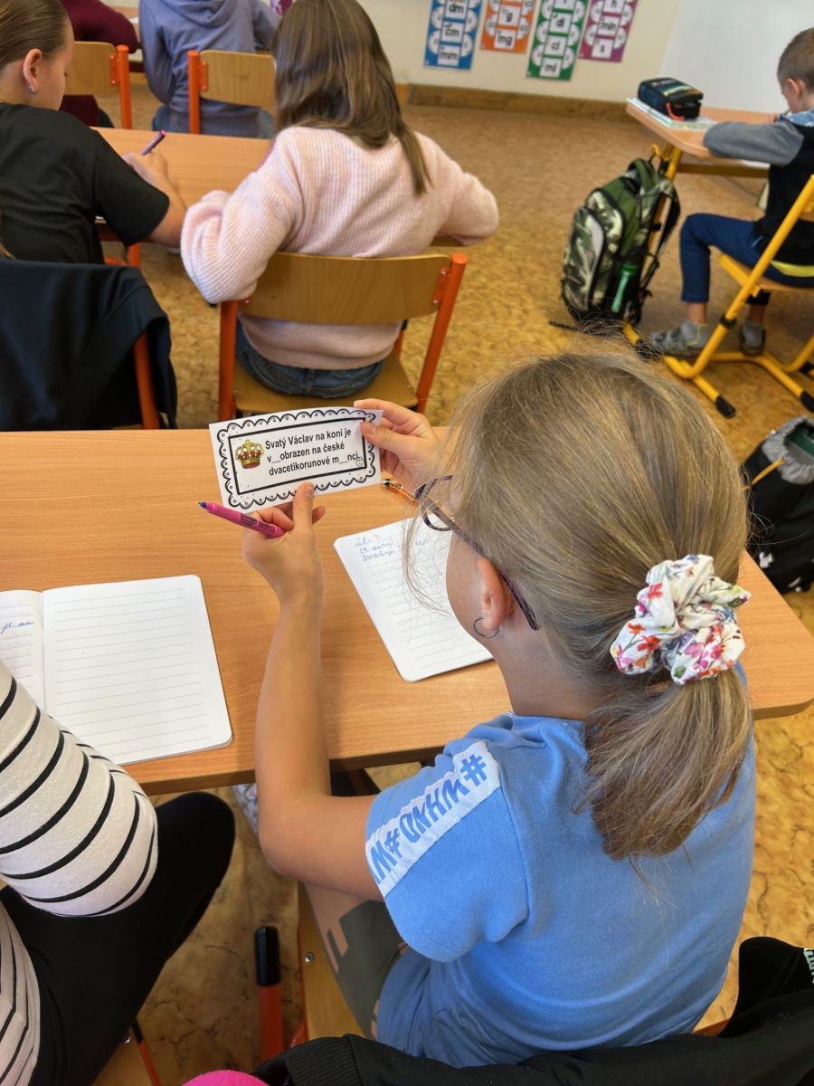 V neděli jsme si připomněli Den české státnosti. Je to významný svátek, a tak jsme se i my ve škole pověnovali patronovi naší země, knížeti Václavovi. Informace o tomto světci ukryté v různých šifrovačkách jsme doplňovali do textu a pomocí tabletů je poté porovnali s komiksovým zpracováním pověsti. Starší žáci si pak pro své spolužáky připravili několik kvízů.