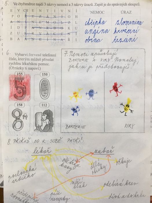 Když se půlka naší třídy doma prala s chřipkou, tak my ostatní jsme se ve škole poprali s daltonským blokem - Naše zdraví. O lidském těle jsme si povídali už dlouho, tak jsme učivo doplnili i o praktickou část. Ukázali jsme si třeba, jak má vypadat lékárnička, potom jsme si i na sobě vyzkoušeli, jak se můžeme sami ošetřit.