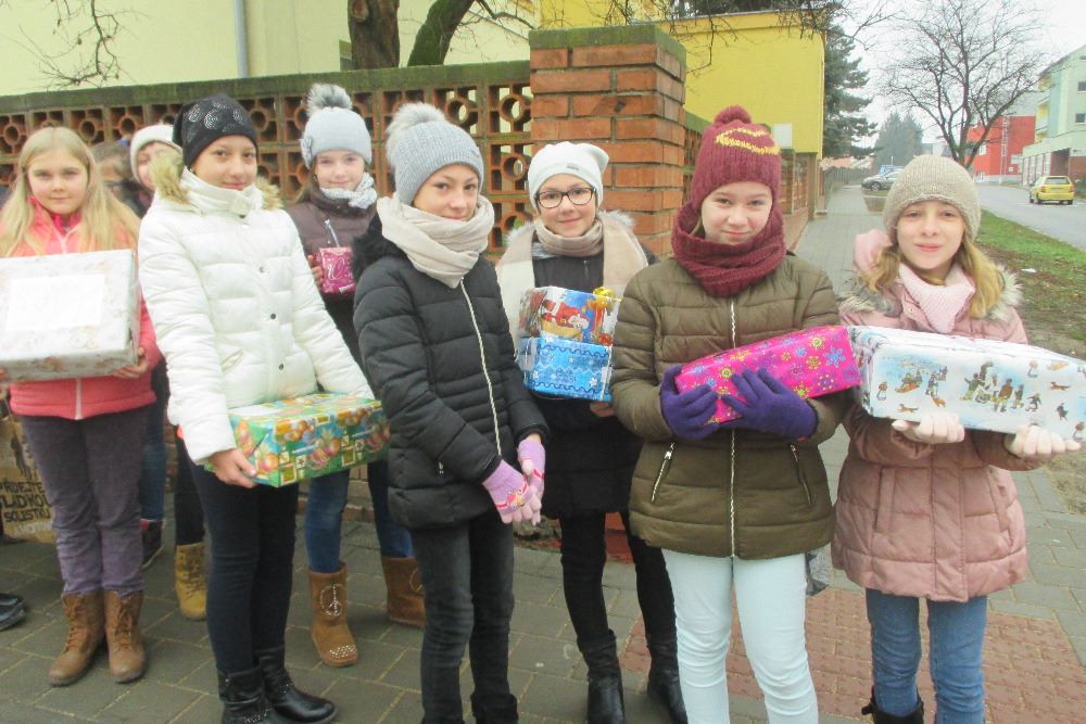 Žáci z 2.A, 2.B, 3.A a 5.B pečlivě připravili spoustu krabic od bot, které naplnili krásnými věcmi, zabalili a odnesli na sběrné místo. Odtud budou následně krabice s dárky rozvezeny dětem.