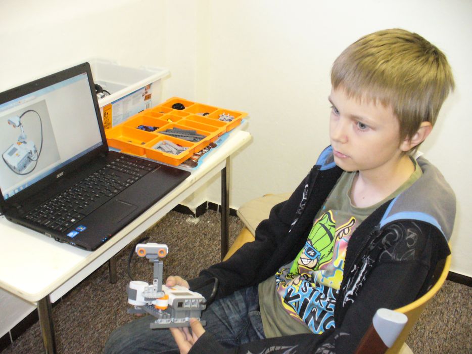si vlastní roboty. Nakonec jsme to všichni zvládli, i když některým z nás stavění podle návodu dalo docela zabrat. Naučili jsme se pojmenovat jednotlivé senzory, zapojit je správným způsobem a začínáme s jednoduchým programováním. Složitější programy nás pak čekají až v osmém ročníku.