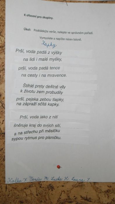 Děti ze III. A se většinou na hodinu čtení těší (což těší p.uč.!). Ta středeční hodina byla trošku zvláštní, ale moooc se im podařila. Rozdělily se do skupin a dostaly neobvyklý úkol. Z rozstříhaných dvanácti veršů měly poskládat báseň. Té potom vymyslet vhodný název a popsat, jaké pocity měly při jejím čtení, jakou barvu či prostředí by jí přiřadily a vše doplnit ilustrací. Na závěr si vzájemně své poskládané básně přednesly, p. uč. jim zarecitovala originální text a věřte či ne, jedna skupinka složila báseň naprosto shodně.