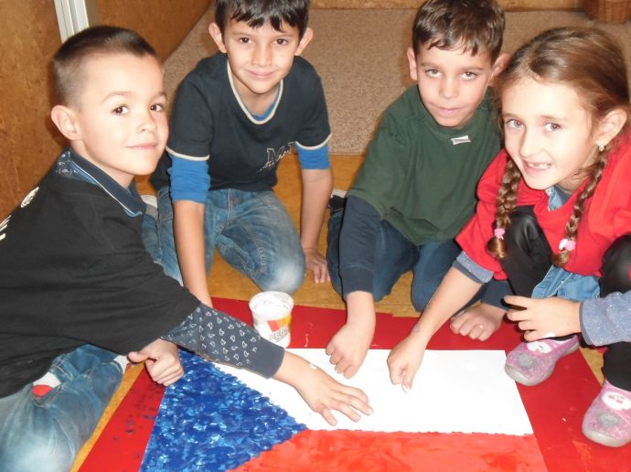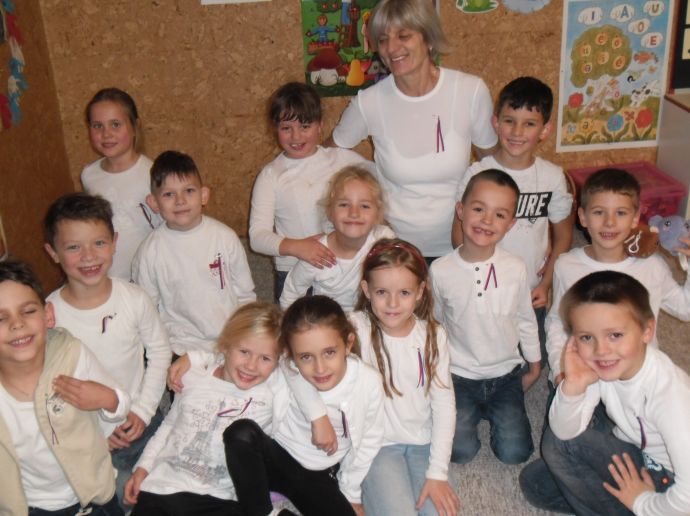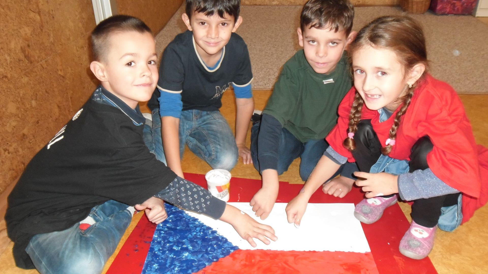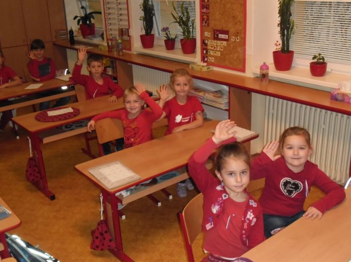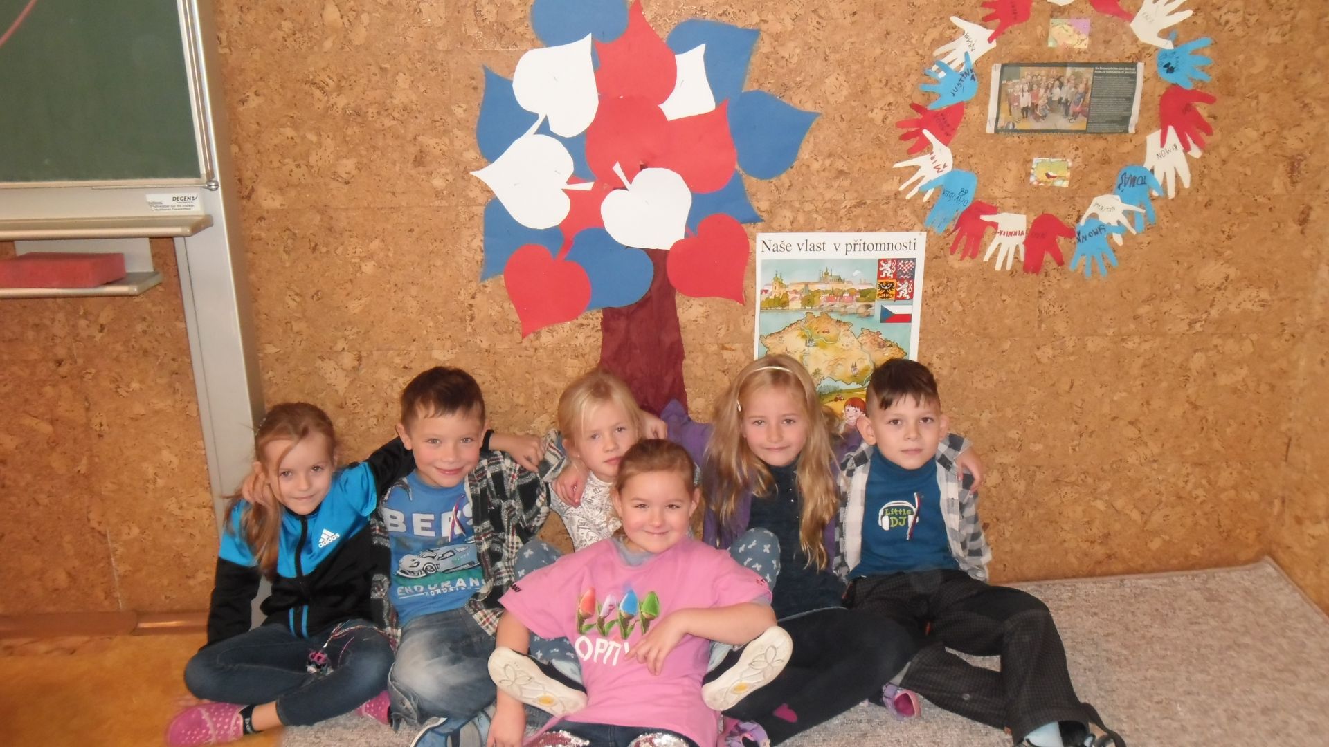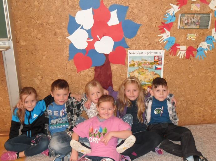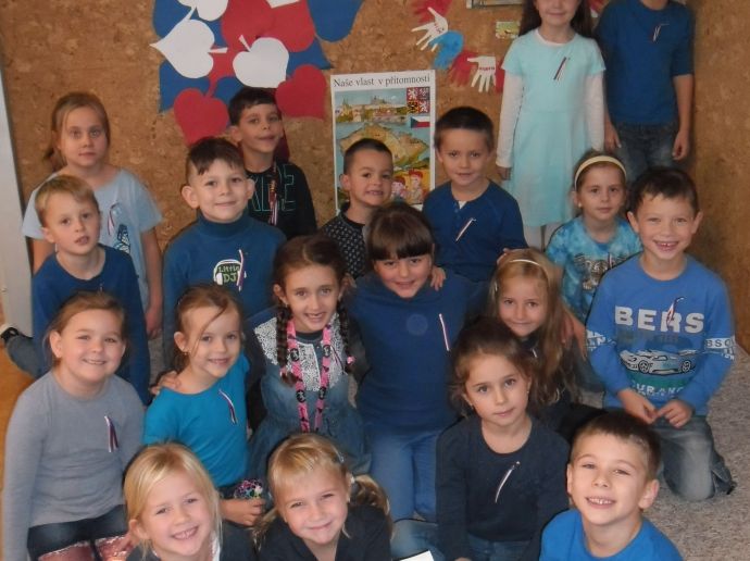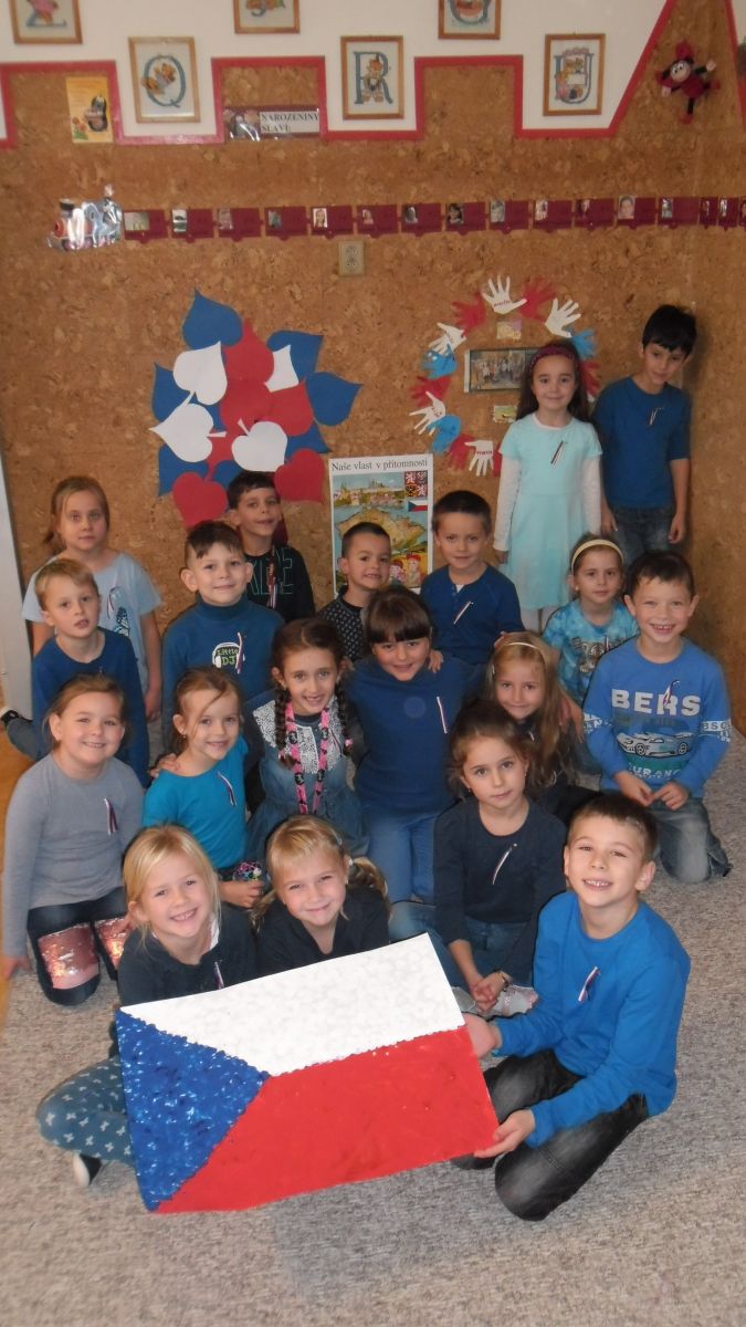 V pondělí všichni v modrém, v úterý bílí, ve středu zase v červené……,vyrábíme vlajku, vyprávíme si o sametové revoluci, zpíváme Kde domov můj, Náměšť, zdobíme třídu, na svá trika připevníme trikoloru a nedočkavě čekáme na náš slavný den „D“.
