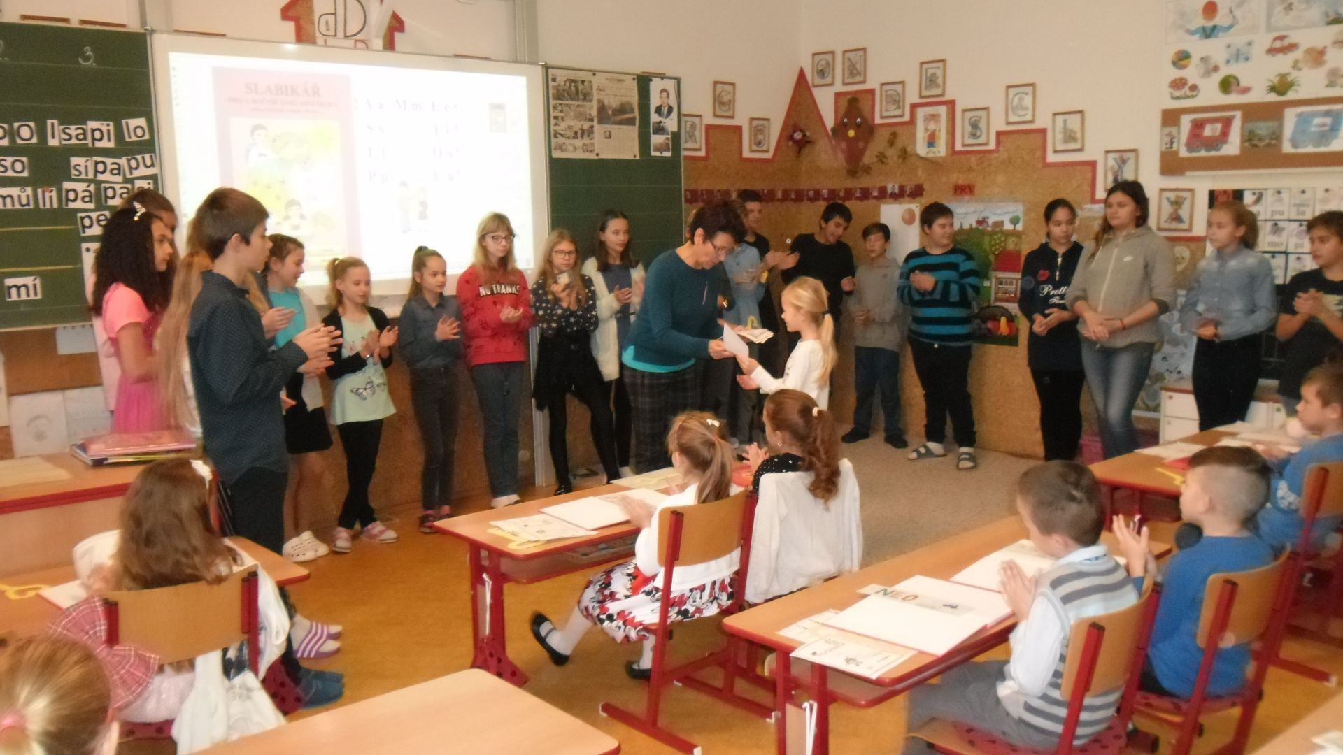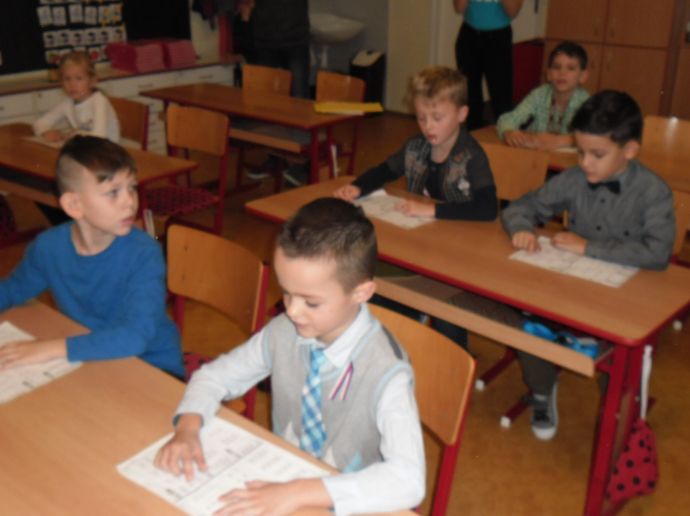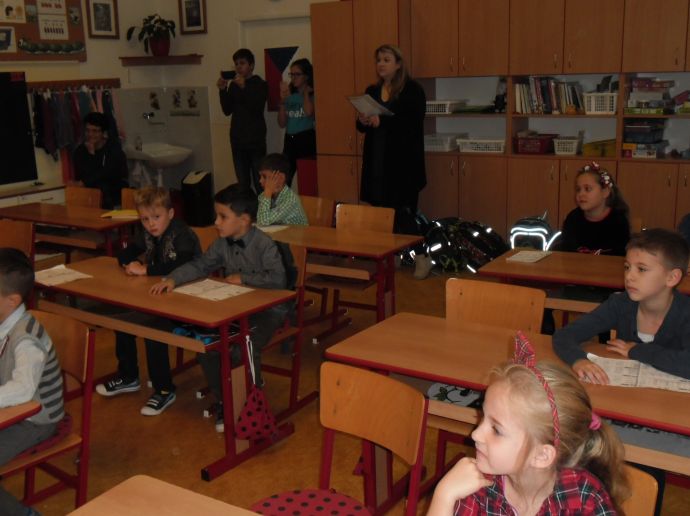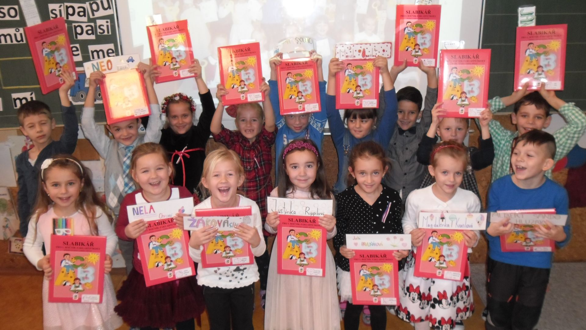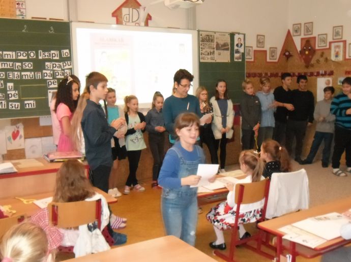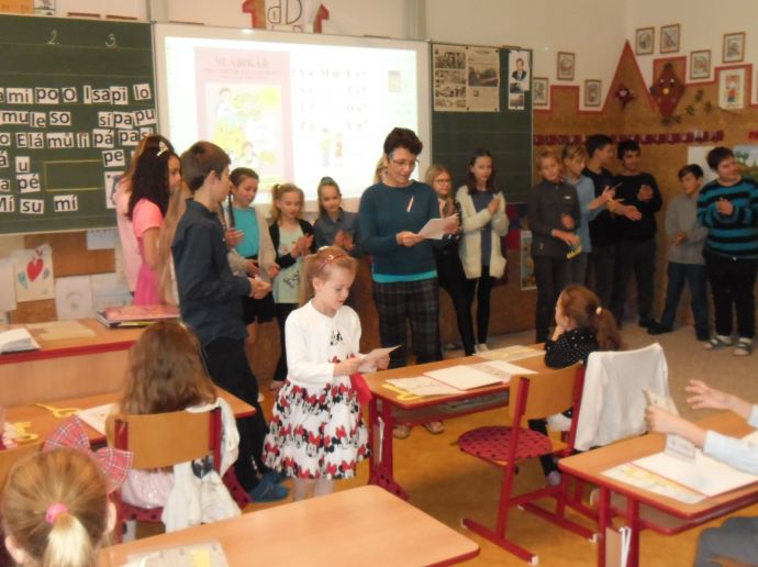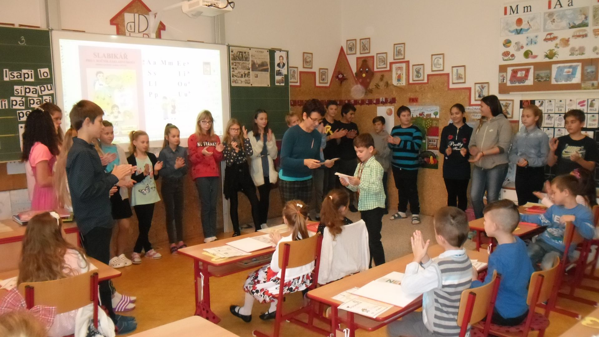 Ve čtvrtek (14.11.) dopoledne se i sluníčko zvědavě kouklo do oken třídy. Prvňáčci svátečně oblečení nedočkavě čekají na první vyučovací hodinu….Dnes jim starší spolužáci ze 6.A totiž přinesou Slabikáře!!