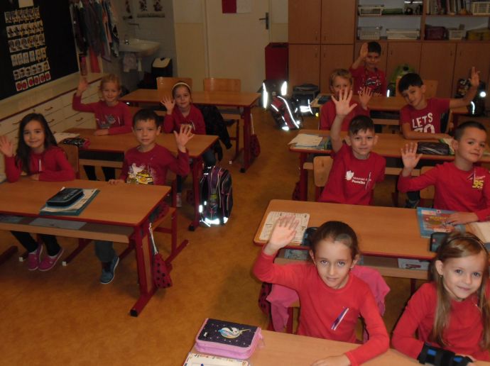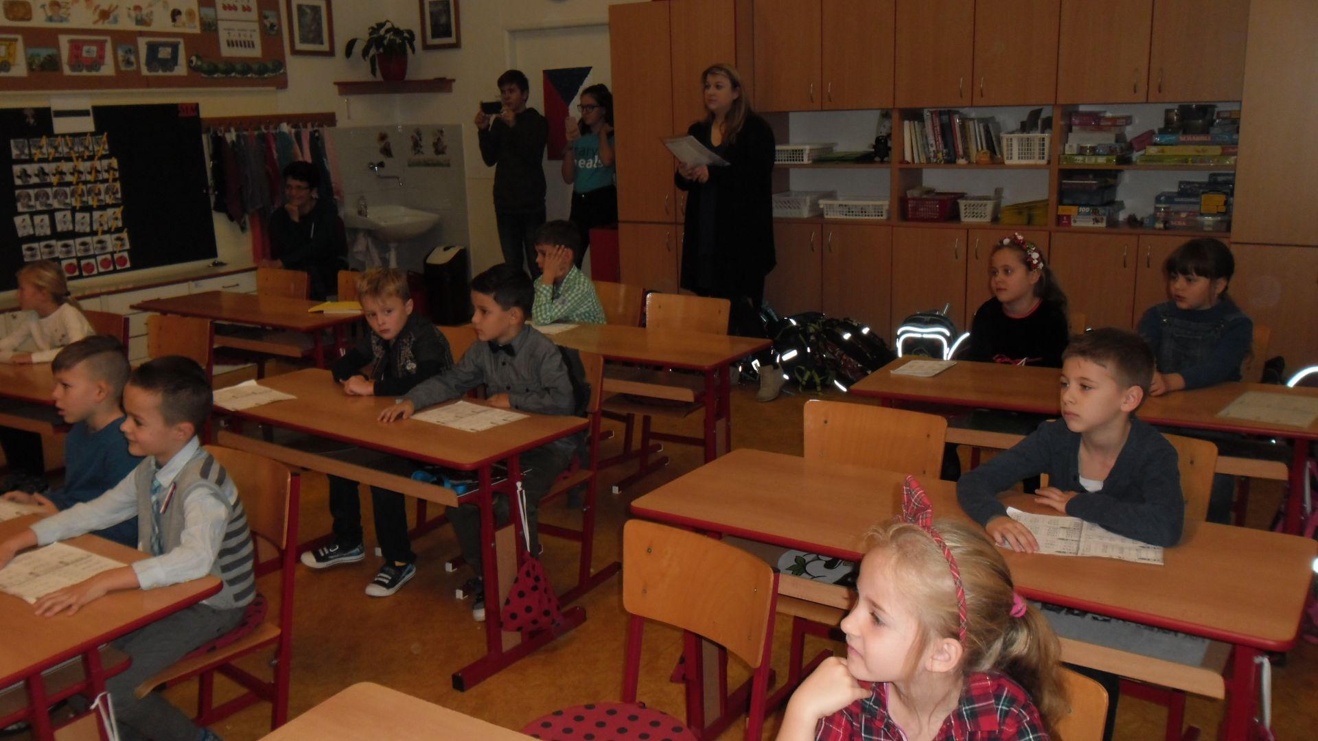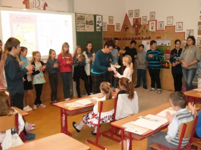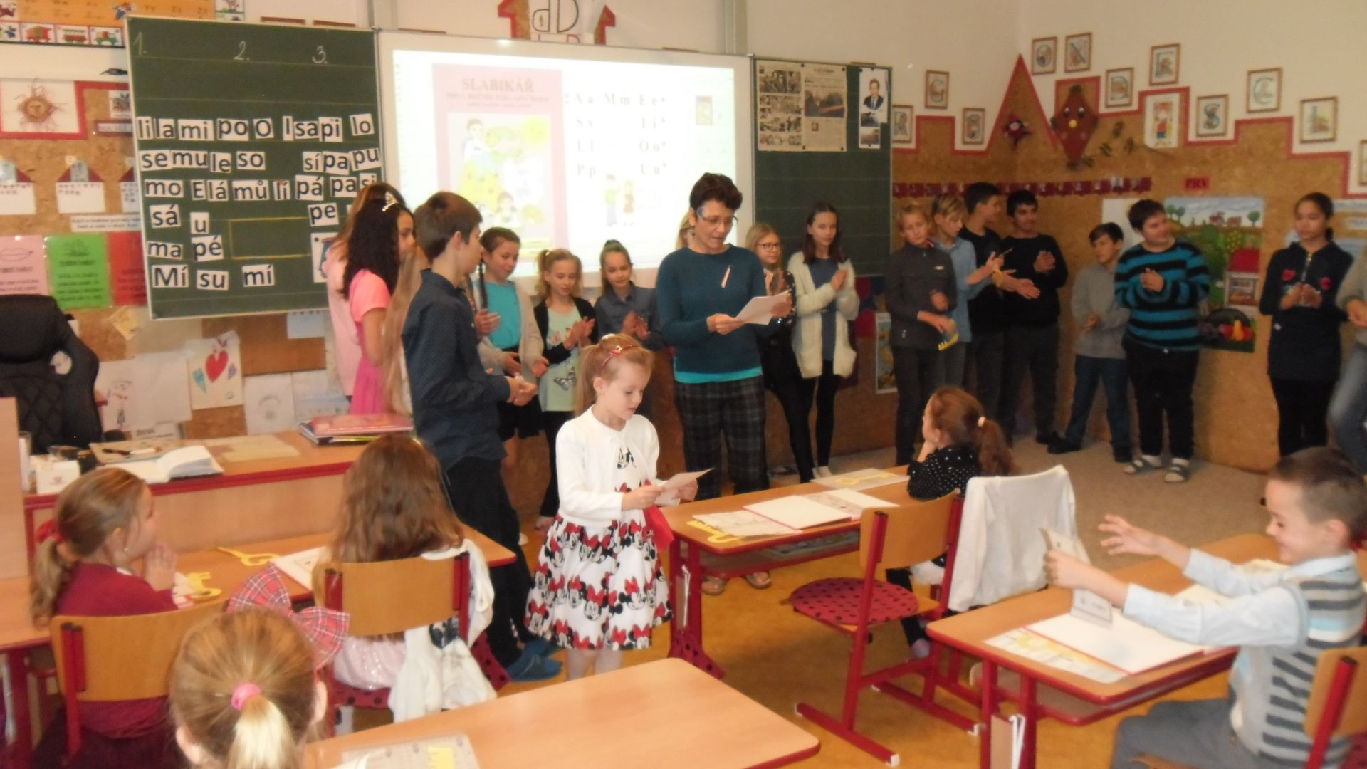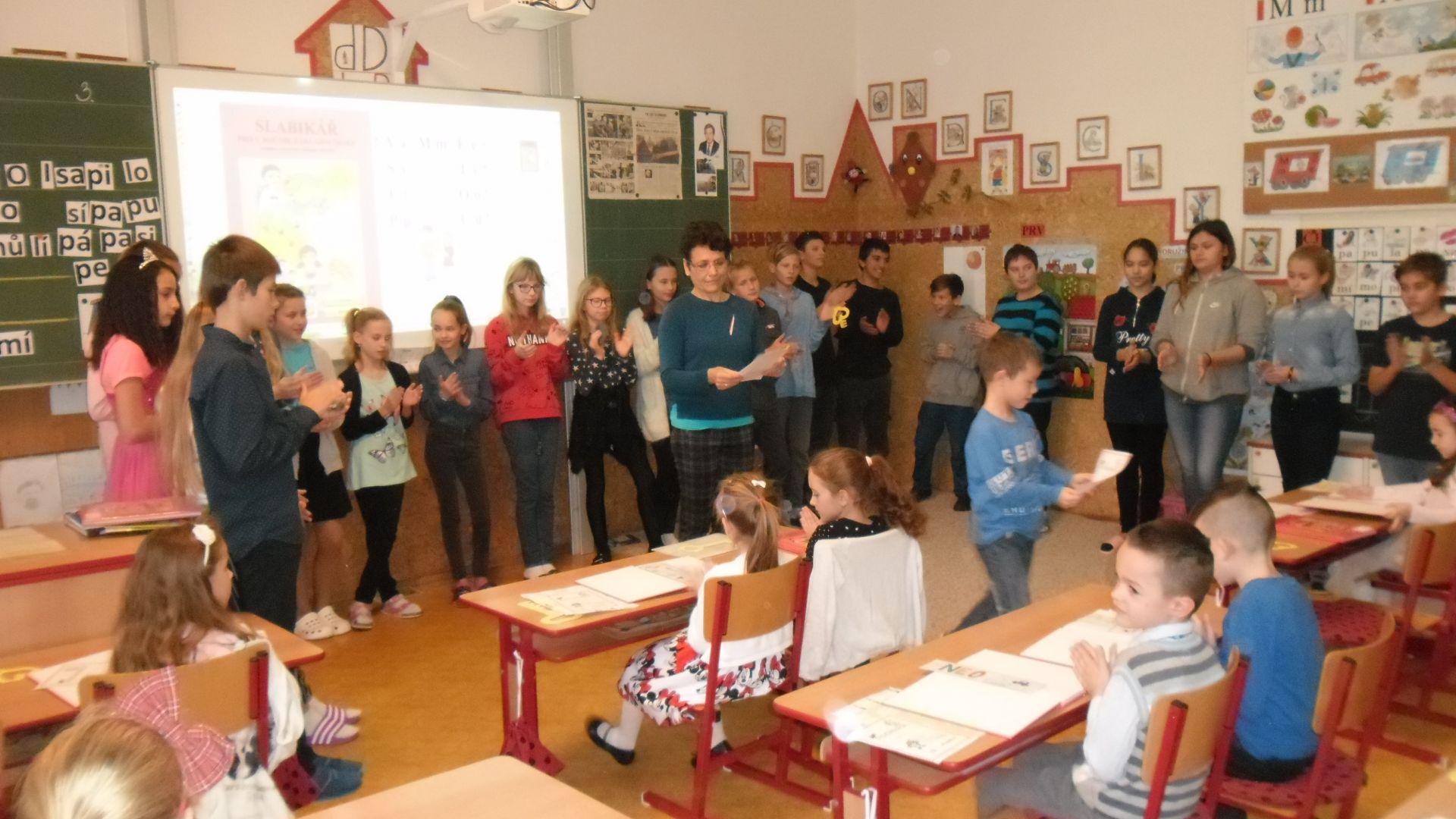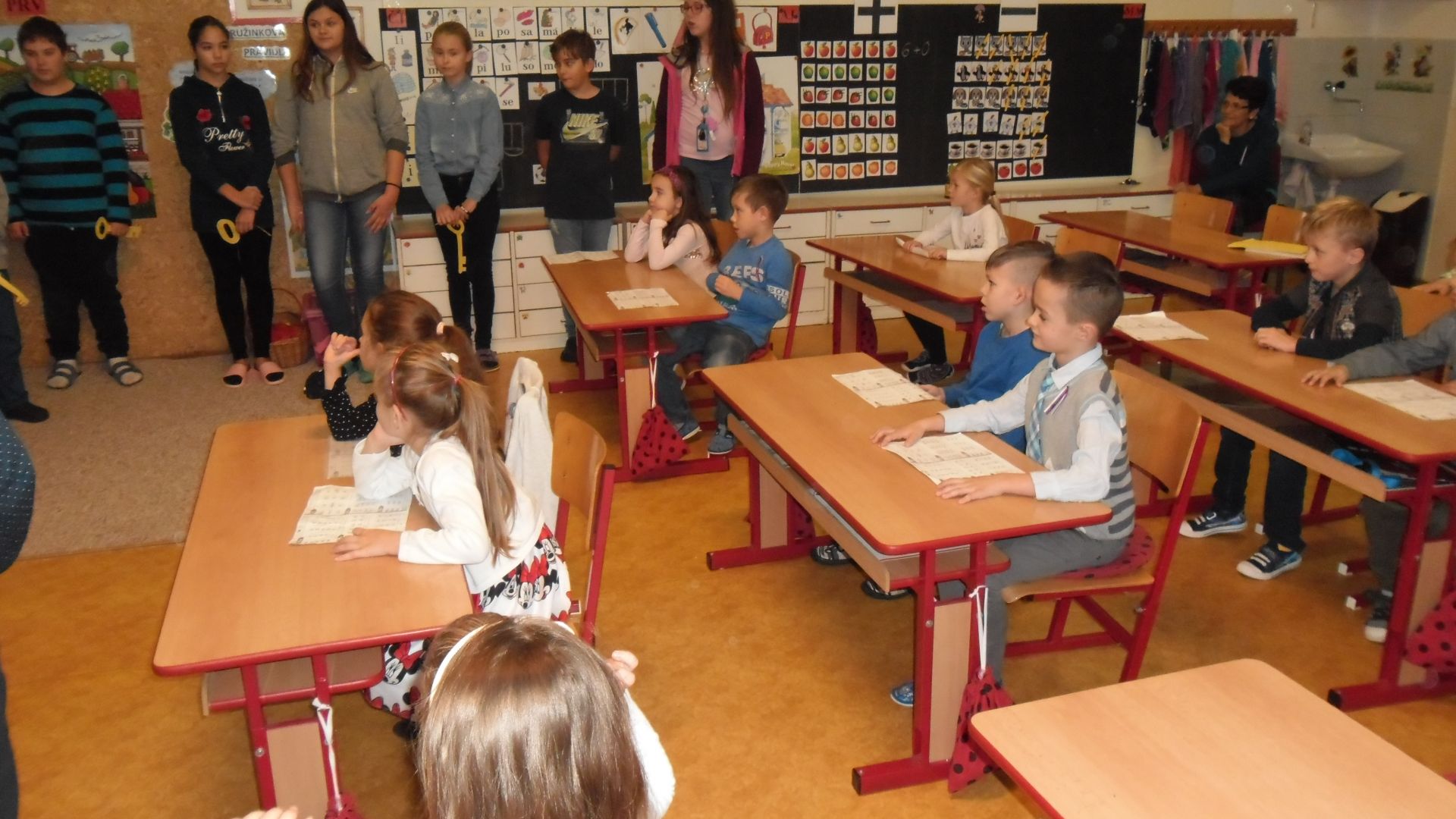 Ve čtvrtek (14.11.) dopoledne se i sluníčko zvědavě kouklo do oken třídy. Prvňáčci svátečně oblečení nedočkavě čekají na první vyučovací hodinu….Dnes jim starší spolužáci ze 6.A totiž přinesou Slabikáře!!