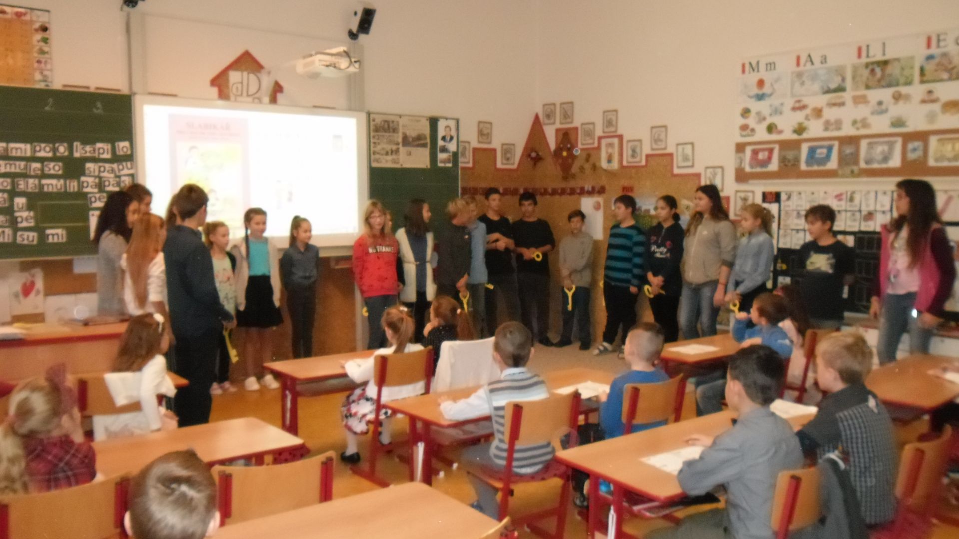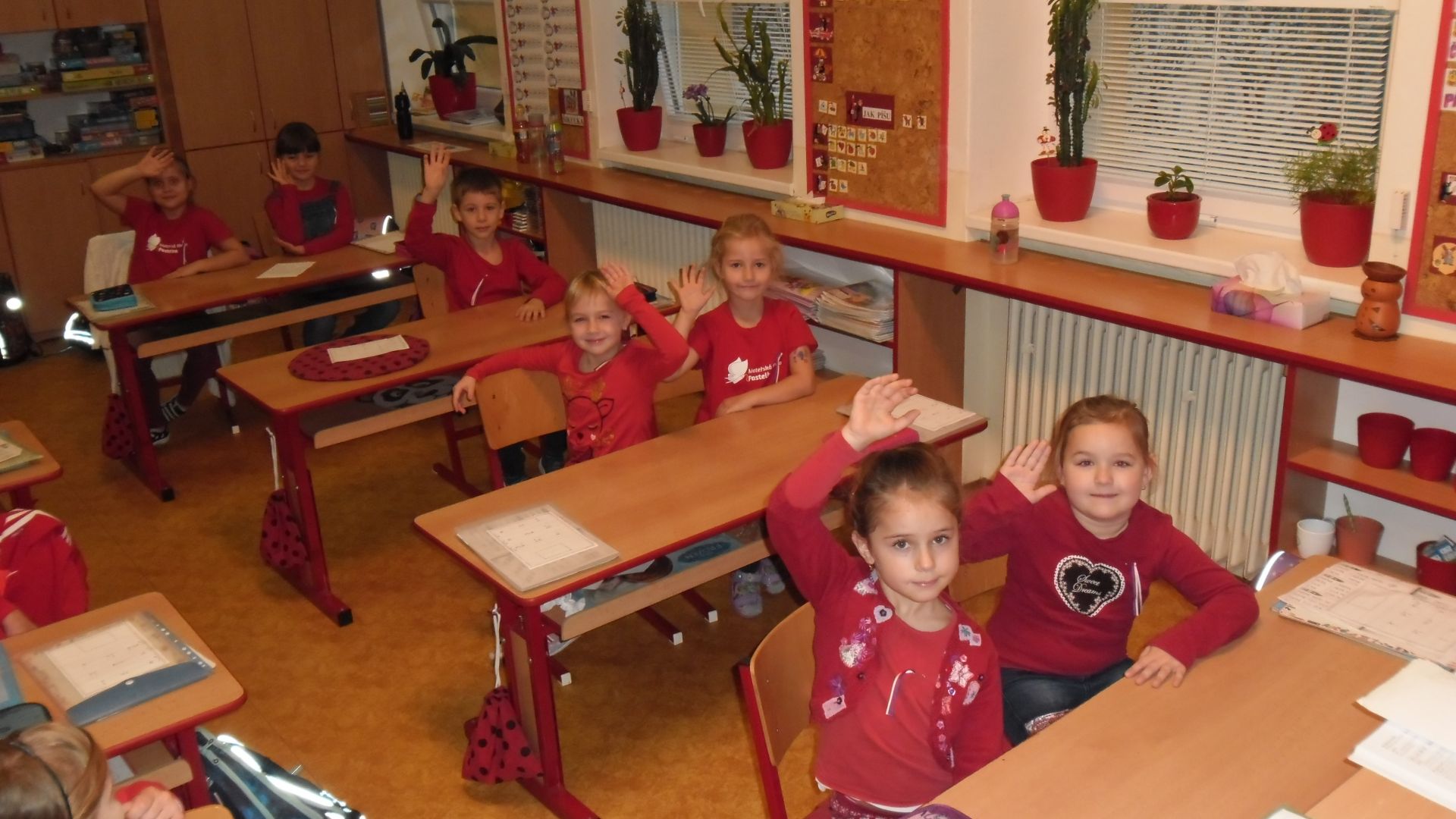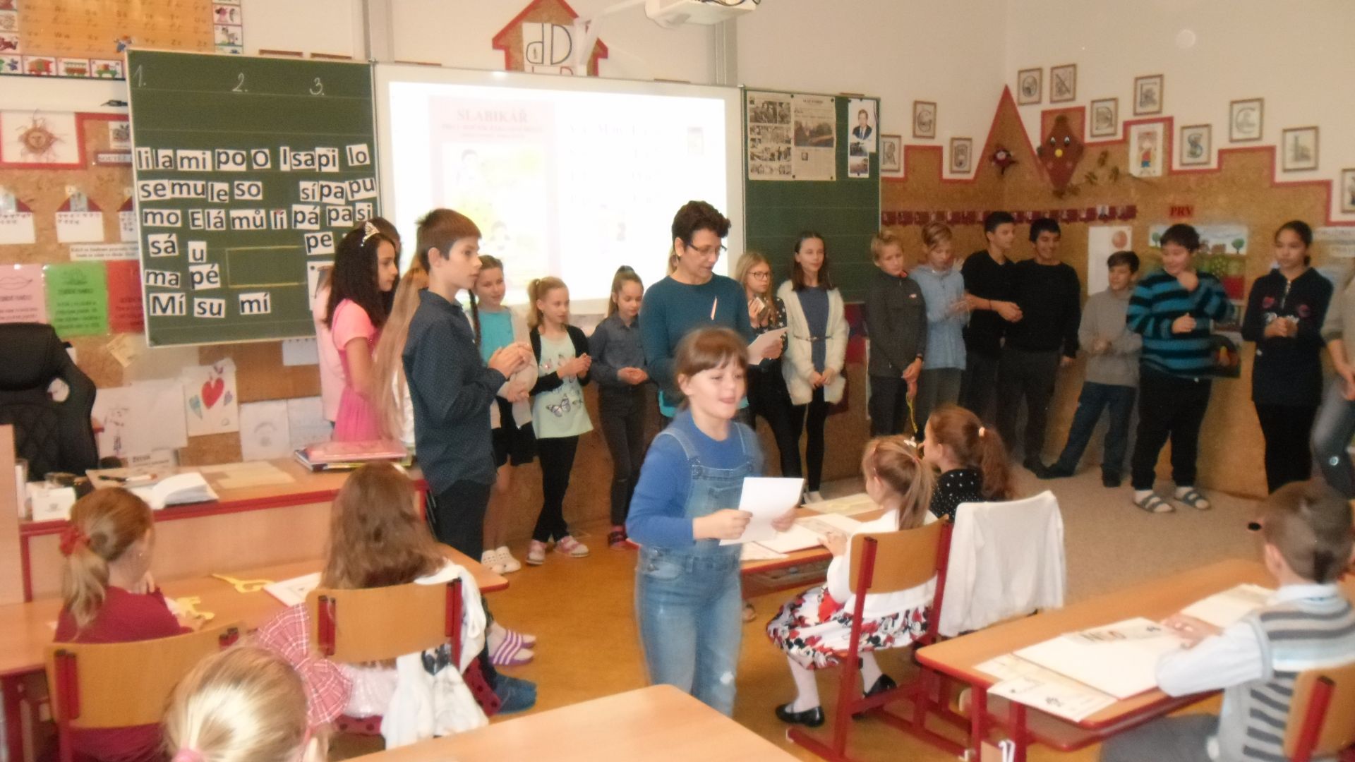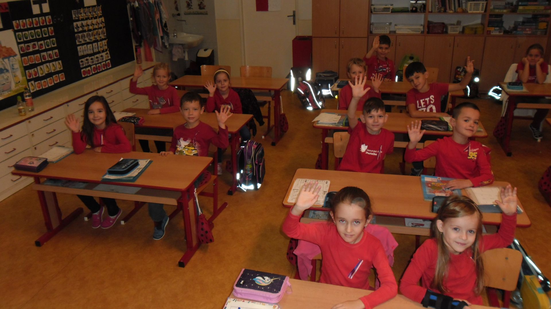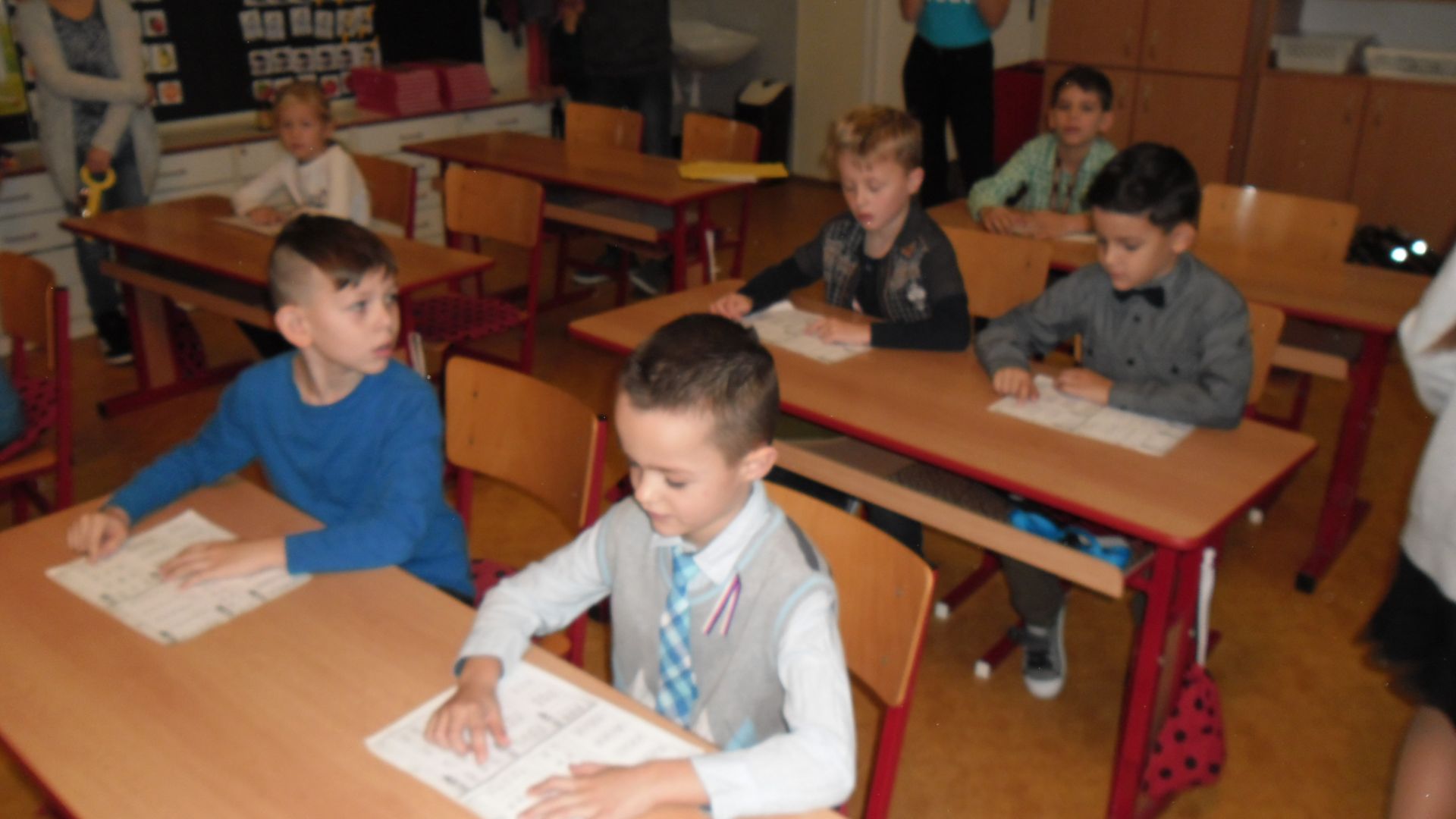 Ve čtvrtek (14.11.) dopoledne se i sluníčko zvědavě kouklo do oken třídy. Prvňáčci svátečně oblečení nedočkavě čekají na první vyučovací hodinu….Dnes jim starší spolužáci ze 6.A totiž přinesou Slabikáře!!