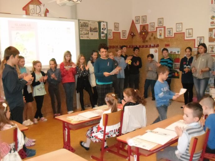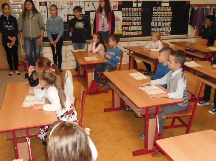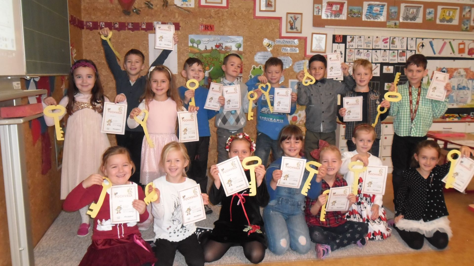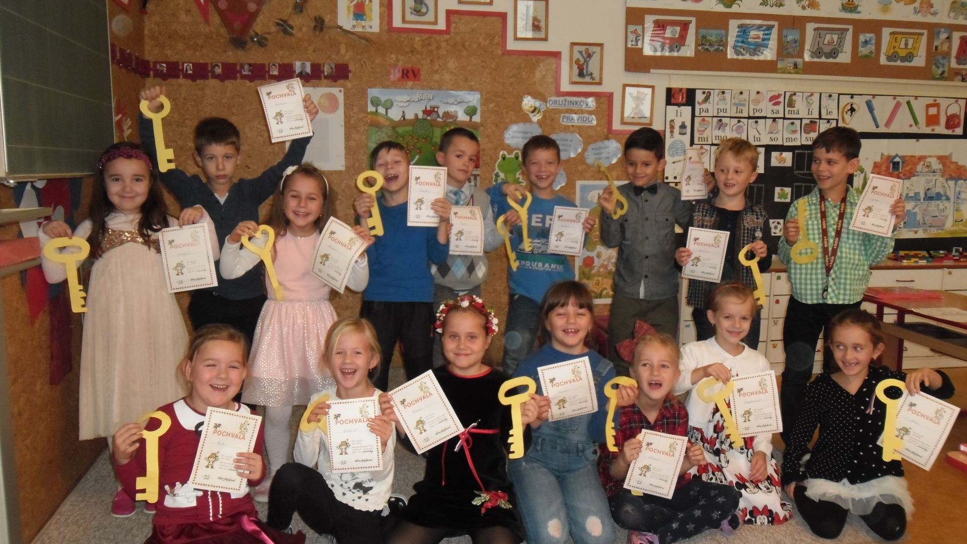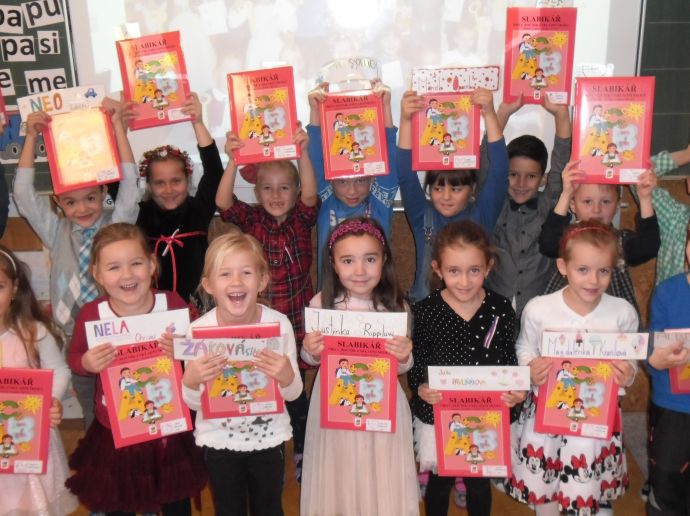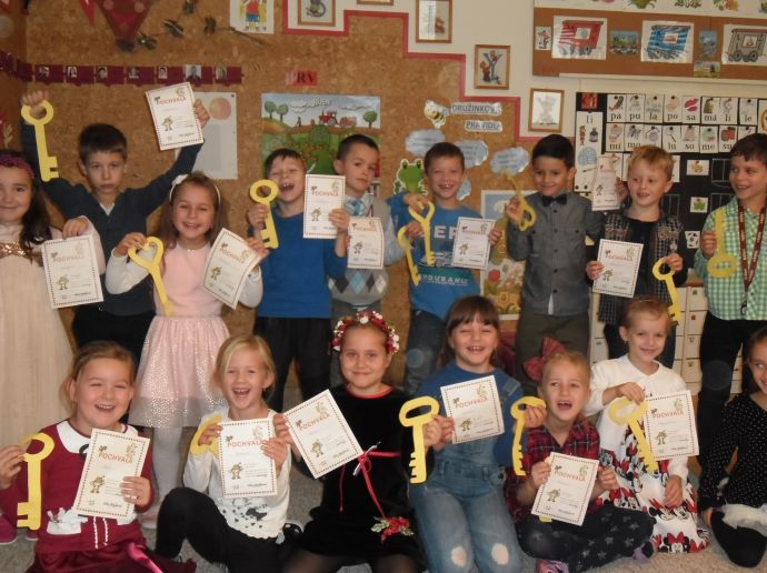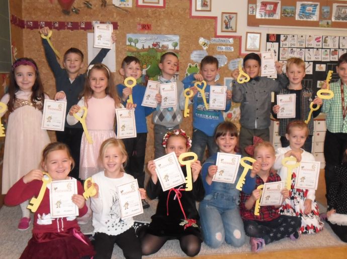 Dočkali se. Šesťáci pod vedením p. uč. Hájkové přišli hned po zvonění, představili svůj krátký program plný veršů o knížkách, ukázali dětem, co je leporelo, encyklopedie, atlas či pohádková knížka. Poté si malí školáci museli vysloužit čarovné zlaté klíče tím, že předvedou, jak již umí číst. Prvních devět písmenek abecedy hravě zvládli, číst slabiky byla pro ně hračka, jen v hlase se to občas zatřepalo trémou - jen to nezkazit. Zlatými klíči osvobodili zakletou princeznu Adélku a ta jim za odměnu předala Slabikáře, krásné záložky s jejich jmény (vyráběli šesťáci - také děkujeme). Od paní zástupkyně následně dostali pochvalný list.