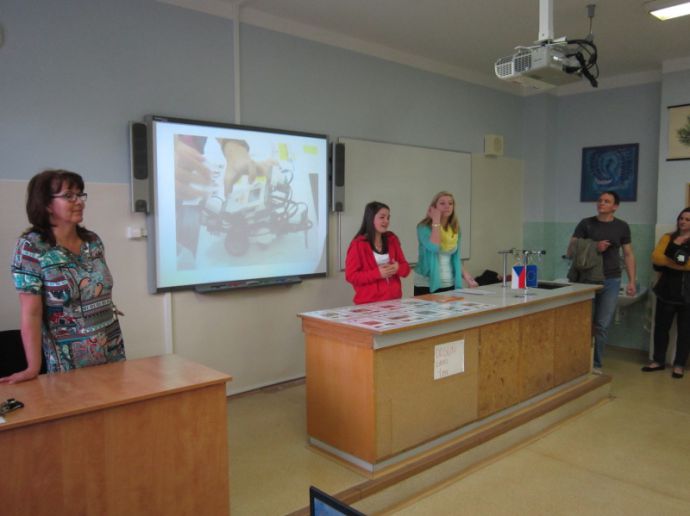 Chlapci z IX. A zde přestavili svůj model robota, se kterým se umístili na celorepublikové soutěži Robotiády v Brně na 6. místě. Robot byl dálkově řízený, musel projet bludištěm, najít medvěda